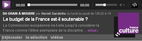 AccueilExpressions par MontaigneLe budget de la France est-il soutenable ? Laurent Bigorgne dans l'émission Du Grain à moudreLa plateforme de débats et d’actualités de l’Institut Montaigne Régulation Cohésion sociale07/10/2013ImprimerPARTAGERLe budget de la France est-il soutenable ? Laurent Bigorgne dans l'émission Du Grain à moudreAuteur Institut Montaigne (Ré)écoutez Laurent Bigorgne sur France culture, invité d'Hervé Gardette, mardi 1er octobre dans l'émission "Du Grain à moudre".Aller plus loin :Consulter la Note - Mettre enfin la fiscalité au service de la croissanceConsulter le Rapport - Redonner sens et efficacité à la dépense publique - 15 propositions pour 60 milliards d’économiesVoir la vidéo - Le budget de l'Etat: comment ça marche ?Découvrir le site internet l'Atelier des finances publiquesImprimerPARTAGER