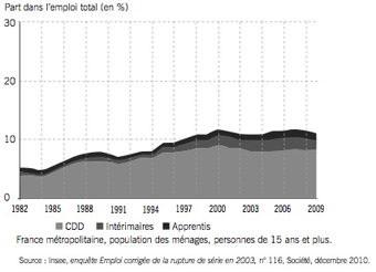 AccueilExpressions par MontaigneLes jeunes et les peu diplômés, premières victimes des contrats courtsLa plateforme de débats et d’actualités de l’Institut Montaigne Régulation Éducation07/12/2011ImprimerPARTAGERLes jeunes et les peu diplômés, premières victimes des contrats courtsAuteur Institut Montaigne La part des "formes particulières de l’emploi" (CDD et contrats saisonniers, intérim, stages et contrats aidés, apprentissage) était en 2009 de 50 % parmi les 15-24 ans contre 13 % des actifs sur l’ensemble de la population (1). Hors contrats en alternance, le nombre de jeunes âgés entre 15 et 29 ans employés en CDD et emplois aidés dans le secteur privé ou dans des entreprises publiques s’élève à 25% et à 5% pour les contrats en intérim contre respectivement 10% et 2% pour l’ensemble des actifs (2).Développement des "formes particulières d'emploi" tous âges confondusLa part des "formes particulières d’emploi" (CDD, contrats saisonniers, intérim, stages et contrats aidés, apprentissage) a doublé en 15 ans, passant de 1982 à 2009 de 5 % à 11 % de l'emploi total.Développement des "formes particulières d'emploi" chez les jeunes de 15 à 24 ansChez les jeunes, la part des "formes particulières d'emploi" a augmenté tout au long des années 1980 et 1990 avant de se généraliser puisqu'elles représentent, en 2009, près de la moitié des emplois, contre près d'un sur cinq en 1982.Dans son étude Un CDI pour tous , l’Institut Montaigne propose de supprimer le CDD et de généraliser le CDI en envisageant très précisément les modalités juridiques d’une telle décision.- Pourquoi proposer un CDI pour tous ? Qu’y gagnent les employeurs ? Qu’y gagnent les employé(e)s ? Les réponses de Céline Gleize, auteur de l’étude Un CDI pour tous. - 15 propositions pour l’emploi des jeunes et des seniors, Rapport, septembre 2010(1) Insee, Marché du travail, séries longues, n° 116, décembre 2010. (2) DARES, Emploi et chômage des 15-29 ans en 2009, octobre 2010, n°072.ImprimerPARTAGER