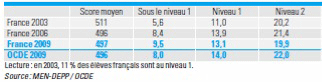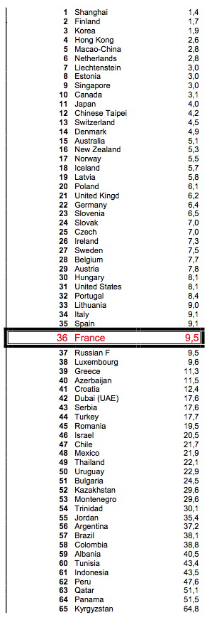 AccueilExpressions par MontaigneMathématiques et échec scolaire dans PISA 2009 : un phénomène minimisé !La plateforme de débats et d’actualités de l’Institut Montaigne Éducation03/01/2011ImprimerPARTAGERMathématiques et échec scolaire dans PISA 2009 : un phénomène minimisé !Auteur Maylis Brandou Directrice adjointe L’Association pour la Prévention de l’Innumérisme a analysé les données de PISA 2009.Avons-nous beaucoup d’élèves en difficulté ? Comment notre pays a-t-il évolué depuis les premières données recueillies par PISA en 2003 ?A première vue, nous pourrions penser que les résultats des élèves français en mathématiques, après avoir baissé entre 2003 et 2006, sont meilleurs en 2009.Cependant, la France est passée en trois ans du groupe des pays de l’OCDE les plus performants au groupe de ceux dont la performance est dans la moyenne. Il existe dans PISA six niveaux de compétences, plus un niveau inférieur au niveau 1, "chacun de ces niveaux correspondants à un ensemble de compétences mathématiques spécifiques" (source OCDE, pdf). Mais la moyenne ne rend pas compte des disparités entre groupes de niveaux, et plus particulièrement ceux situés aux extrémités (niveaux 0 -1 et niveaux 5-6).Echec scolaire en hausse, élite en baisseLa proportion d’élèves en très grande difficulté en mathématiques (inférieur au niveau 1) – qui "sont incapables d’appliquer de manière routinière les connaissances et compétences mathématiques les plus élémentaires que l’enquête PISA cherche à mesurer"[1] et ne peuvent résoudre que 50% des tâches les plus simples – est en progression constante. En effet, entre 2003 et 2009, cette proportion de la population scolaire est passée de 5,6% à 9,5%. Quant à celle des élèves en grande difficulté (niveau 1) – à savoir ceux uniquement capables "de suivre des instructions directes et explicites, d’exécuter des actions qui vont de soir et d’appliquer des modèles simples à des problèmes sans difficulté qui s’inscrivent dans des contextes familiers"[2] –, elle est passée de 11% à 13,1%. Nous sommes donc passés de 16,6% à 22,6% d’élèves en grande et très grande difficulté. Soit, comme corroboré par la récente note d’information du ministère de l’Education nationale, plus d’un élève sur 5 se situant au niveau 1 ou en-deçà[3].Scores moyens et pourcentages d’élèves par niveau de compétences en culture mathématique pour la France et l’OCDEA l’autre bout du spectre, la proportion d’élèves très performants (niveau 5 et 6) en mathématiques a également baissé depuis 2003, passant de 15,1% à 13,7%.La France parmi les pays ayant la proportion d’échec scolaire la plus élevéeEn ne considérant que les élèves en très grande difficulté, la France se place au 21ème rang des pays européens (sur 25 pays ayant participé), soit parmi les derniers aux côtés de la Grèce, de la Roumanie, de la Bulgarie et du Luxembourg.Au classement de l’OCDE, elle se classe 28ème sur 34 pays membres, et 36ème sur 65 (en comptant les économies et pays partenaires de l’OCDE ayant participé à PISA), presque ex æquo avec la Russie.Taux en % d'élèves en très grande difficultéSource : Association pour la prévention de l’innumérisme, extraits partiels et retraités des tableaux de PISA 2009, table 1-3-1 page 221.Un quart des jeunes français âgés de 15 ans souffrent donc d’un réel retard en mathématiques, alors que deux médailles Fields de mathématiques (récompense la plus prestigieuse pour les travaux en mathématiques) ont cette année été décernées à deux Français. Si la filière scientifique au lycée est aujourd’hui la filière d’excellence et que la France est fière de son système de grandes écoles d’ingénieurs, rappelons toutefois que les pays qui ont une proportion d’élite supérieure à celle que nous avons ont également une faible proportion d’élèves en échec scolaire.Quelle est la corde la plus sensible ? Le sort des élèves en difficulté suscite-t-il moins d’intérêt que celui des plus performants ? Par un bout ou l’autre, peu importe, il faut saisir le problème à pleine main : réduire drastiquement le nombre d’élèves en difficulté, augmenter la proportion de bons élèves et réduire l’écart entre les deux. Il n’y a pas de fatalité.Nous ne pouvons plus faire l’économie d’une recherche de très haut niveau en éducation – évaluée et transposable – en liaison avec le travail effectué dans les salles de classe, seule à même de faire progresser les outils mis à disposition des enseignants. Si nous voulons véritablement enrayer la baisse de performances de notre pays, réduire le nombre d’élèves en grande difficulté et gonfler notre élite, nous ne pouvons plus faire l’économie de la création de centres de recherche spécialisés en éducation, pluridisciplinaires et internationaux. La recherche en mathématiques est quasi inexistante en France et peu d’expérimentations dans ce domaine ont vu le jour. Celles actuellement conduites par Michel Vigier, président de l’association pour la Prévention de l’Innumérisme, ont permis d’améliorer significativement les résultats d’élèves en classes S.E.G.P.A (Section d'Enseignement Général et Professionnel Adapté). Ces résultats sont très prometteurs et doivent être évalués rigoureusement.- Le site de l’Association pour la Prévention de l’InnumérismeNotes[1] OCDE 2006, Regards sur l’éducation, p. 89.[2] Ibid., p. 88.[3] DEPP, note d’information N° 10.23 "L'évolution des acquis des élèves de 15 ans en culture mathématique et en culture scientifique : premiers résultats de l'évaluation internationale PISA 2009", 2010.ImprimerPARTAGER