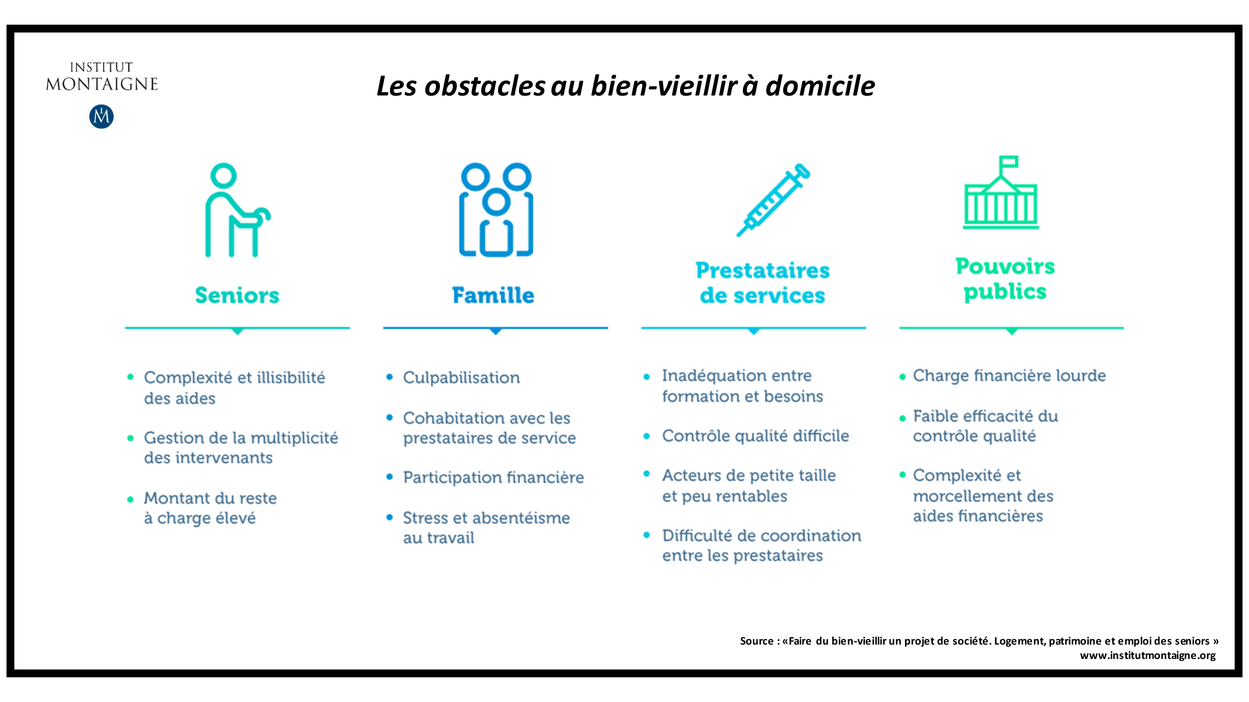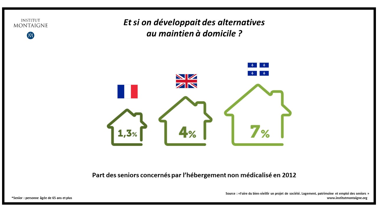 AccueilSantéFaire du bien-vieillir un projet de sociétéRapport Juin 2015Faire du bien-vieillirun projet de société Santé SociétéPARTAGER Groupe de travail Cette publication est le fruit d’un groupe de travail réuni par l’Institut Montaigne et présidé par Nicolas Moreau, Président directeur général d’AXA France.Nicolas Moreau, président directeur général, AXA France, président du groupeChristophe Angoulvant, Senior Partner, Roland BergerAndrew Alston, directeur général entreprises et secteur public, CiscoLouis Champion, président directeur général, IP SantéMatthieu Labrousse, Senior Manager, Roland Berger, rapporteur du groupe de travail assisté de Bastien Pahus, consultant, Roland BergerSabine Leboulanger, présidente, SLB PartnerSébastien Marché, directeur des affaires stratégiques, Orange HealthcareAndré Masson, économiste, directeur de recherche CNRS, directeur d’études EHESS, École d’Économie de Paris et Chaire Transitions démographiques, Transitions économiquesMagali Masson-Deblaize, Executive Assistant du président, AXA FranceRaphaël Mastier, responsable du Marché Santé, Division Secteur public, Microsoft FranceDominique Monneron, conseiller du Comité de Direction, en charge de la coordination du projet « adaptation de la société au vieillissement », Direction Générale, Caisse des Dépôts et ConsignationsAlexia de Monterno, directrice adjointe, Institut MontaigneAlexis Moreau, directeur général, Cogedim@ClubClothilde Morgan de Rivery, chargée de mission, Département de la Stratégie, Caisse des Dépôts et ConsignationsPhilippe-Olivier Rousseau, directeur des affaires publiques, BNP ParibasHelene Sancerres, directrice de la conduite du changement, CiscoPierre Tarrade, notaireJean-Pierre Wiedmer, président, MercerThierry Zylberberg, Executive Vice President, Groupe Orange et directeur, Orange Healthcare Personnes auditionnées Luc Broussy, conseiller Général du Val d’Oise, maire-adjoint de Goussainville et ancien délégué national du PS aux personnes âgéesFrançoise Forette, gérontologue, présidente de la Fondation nationale de GérontologieFrançois Georges, président, Syndicat National des Résidences avec services pour AinésFrédéric Lavenir, directeur général de CNP AssurancesBertrand Martinot, ancien délégué général à l’Emploi et à la Formation professionnelleSimon Van Melle, Finances RH, Chaire Transition Activité Retraite, AXA France.Jean-Philippe Sarrette, directeur général, AREPABenoît Klein, directeur immobilier public, SNIFrédéric Walther, directeur général, Domitys Télécharger 1. Emploi des seniors (11 pages) 2. Favoriser le bien vieillir (7 pages) 3. Les Résidences Seniors (6 pages) 4. Des solutions pour les seniors à revenus insuffisants (6 pages) 5. Pour une meilleure équité intergénérationnelle (7 pages) Rapport (104 pages)